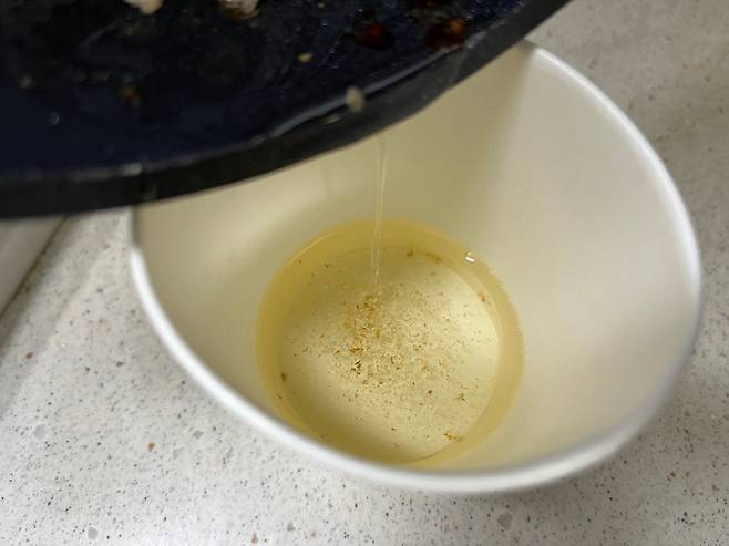 삼겹살을 먹고 나니 기름이 꽤 많이 나왔습니다. 액체 상태의 삼겹살 기름은 음식물 쓰레기로 배출할 수도 있습니다.