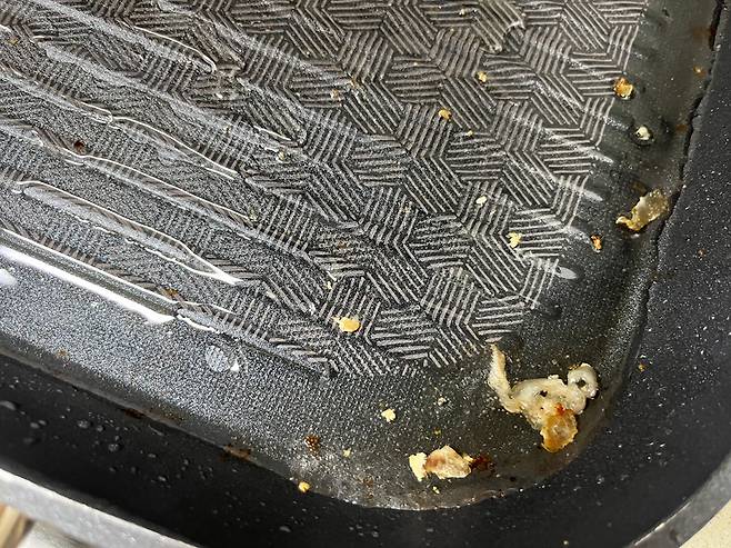 밀가루로 팬에 닦았더니, 기름기가 거의 안보이죠? 삼겹살 구워 먹은 후 뒤처리가 고민이라면 밀가루를 활용해 보세요. 설거지가 훨씬 쉬워집니다!