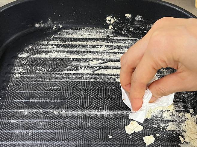 기름이 얼마 없는 경우, 키친타월로 몇 번 닦아주면 되지만 기름기가 많이 남았을 때는 밀가루를 활용해 보세요.