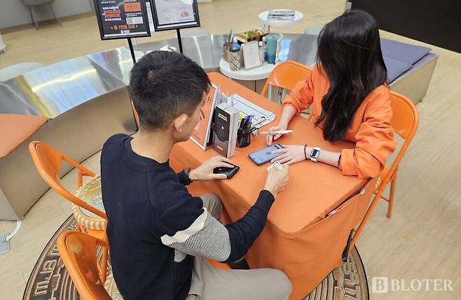 라운지에 위치한 창구에는 빗썸 직원과 KB국민은행 직원이 각각 두 명씩 상주한다. KB국민은행 직원이 금융계좌를 연동하면, 직원이 바로 옆자리에서 스마트폰 빗썸 앱 설치와 가입을 돕는다. 별도의 이동 없이 은행과 거래소 업무가 연동되는 셈이다.