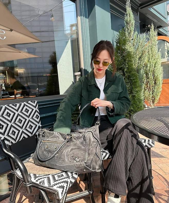 사진 속 다솜은 딥그린 셔츠형 재킷에 화이트 티셔츠, 와이드한 블랙 팬츠를 매치해 도회적인 무드를 연출했다. 선명한 선글라스를 살짝 내려쓴 그녀는 카페 테라스에 앉아 자연스럽게 가방을 열고 있는 모습. 무심한 듯 시크한 그 손끝의 움직임조차 스타일리시하다.