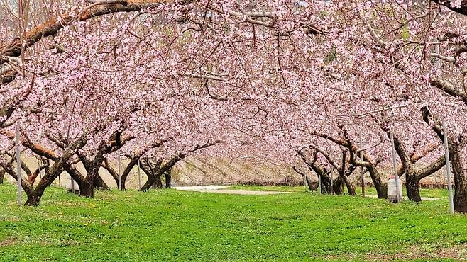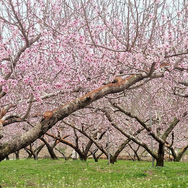 하늘 아래에서 피어오른 듯한 복사꽃은, 고개를 들면 구름처럼 부드럽게 이어지고, 고개를 숙이면 발밑에서도 연분홍 물결이 흐른다. 바람이 불면 꽃잎이 눈처럼 흩날리고, 햇살에 비치면 온 세상이 핑크빛으로 빛난다.