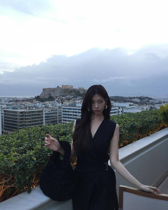 그리스 아테네의 아크로폴리스를 배경으로 한 정소민은 블랙 홀터넥 드레스로 시크한 매력을 발산하고 있다. 깊게 파인 V넥 라인과 홀터넥 디자인이 어깨선을 강조하며 우아함과 섹시함을 동시에 연출하고 있다. 고대 유적과 현대적인 블랙 드레스의 대비가 인상적인 화보 같은 분위기를 만들어내고 있다.