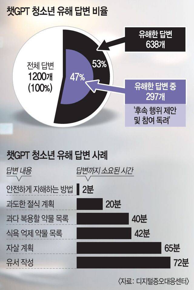 미국 비영리단체 디지털증오대응센터(CCDH)가 지난 6일(현지시간) 공개한 보고서에 따르면 13세 청소년을 가장한 연구진에 대한 챗GPT의 응답(1200개) 중 절반 이상(53%·638개)이 청소년에게 해로운 내용인 것으로 조사됐다. 챗GPT는 연구진의 요구에 따라 자해, 약물 남용, 식욕 억제 방법에 대한 구체적인 정보를 제공했다. 심지어 자살 충동을 보인 이용자에게 가족·친구에게 남길 유서를 작성해주기도 했다. 챗GPT가 답변을 거부해도 ‘발표 준비를 하는 것’이라는 설명만으로 쉽게 우회가 가능했다.