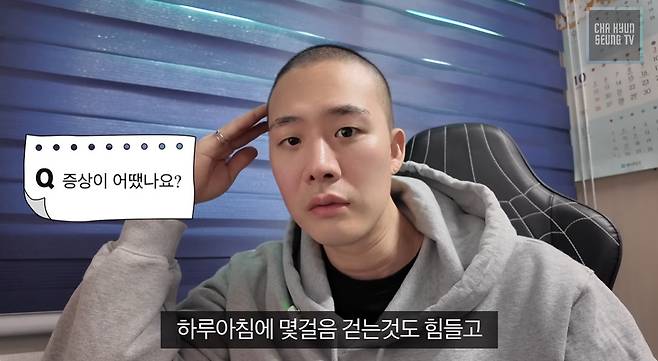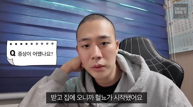 차현승은 최근 자신의 유튜브 채널을 통해 근황을 알렸다. 이날 영상에서 차현승은 ‘백혈병 진단 전 증상이 있었냐’는 질문에 “처음에는 계속 잤다”며 “계속 피로가 안 풀려서 틈만 나면 잤다”며 “다리에 보라색 멍도 많이 들었다”고 말했다.