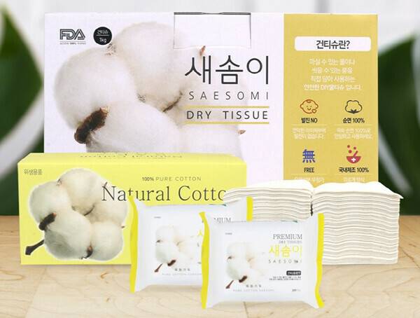 새솜이 브랜드의 건티슈는 방부제, 형광증백제, 중금속, 파라벤, 알코올, 인공 색소 등 8가지의 유해 물질을 사용하지 않은 제품이다. 고압의 물을 분사해 섬유를 압착하는 워터제트 방식으로 제조돼, 잡먼지까지 깔끔하게 제거된 채로 제조된다. 의약외품 탈지면 제조 방식인 과산화수소로 표백이 이뤄져, 새하얀 색을 가지고 있지만 표백제 걱정 없이 안심하고 사용할 수 있다. 1㎏ 대용량 패키지가 24,500원의 판매가로 판매 중이다.