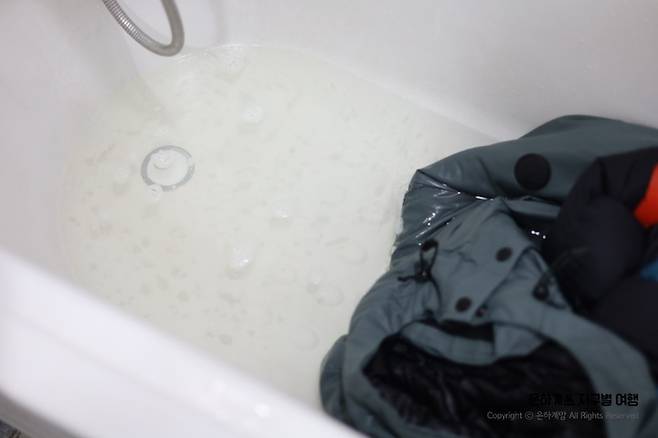 3) 손으로 패딩점퍼를 조물조물 주물러주고, 1~2시간 정도 이대로 불립니다.