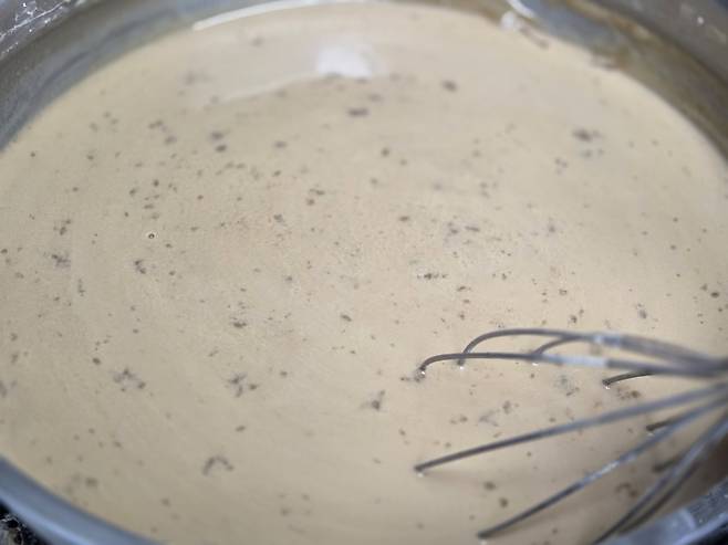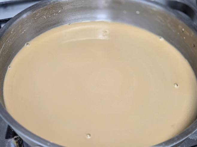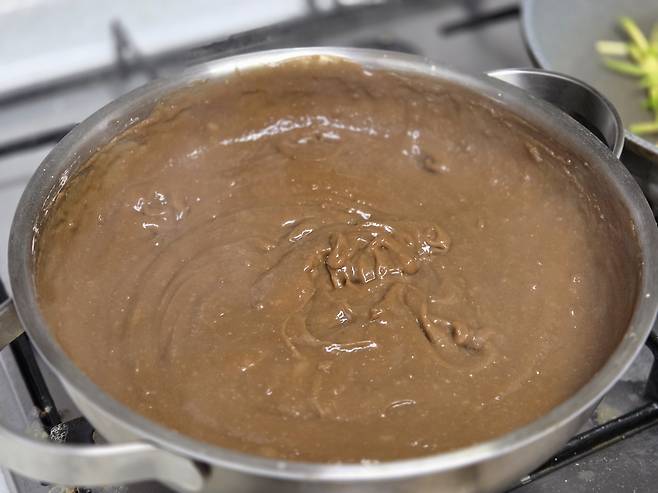 조리할 때 들기름을 함께 넣으면 도토리묵이 냄비에 눌어붙는 것을 방지해주고, 질감도 한층 부드러워집니다. 익는 동안 전체적으로 기름막이 형성돼 골고루 익고, 묵이 잘 퍼지지 않아서 탄력 있는 상태로 굳게 됩니다.