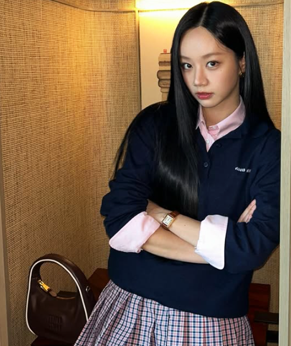첫 번째 스타일은 단정하면서도 사랑스러운 스쿨룩 콘셉트로, 체크 플리츠 스커트와 핑크 셔츠, 네이비 니트의 조합이 청초한 분위기를 자아낸다.