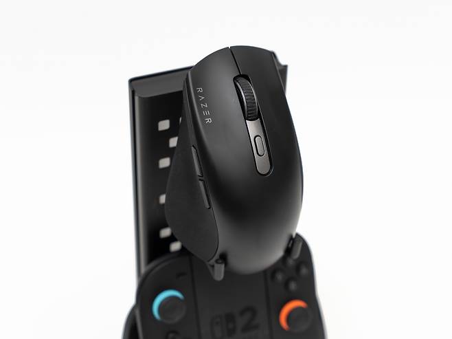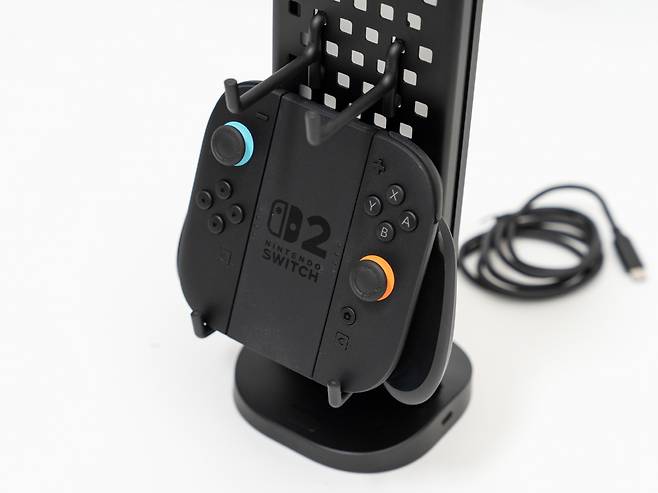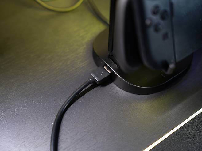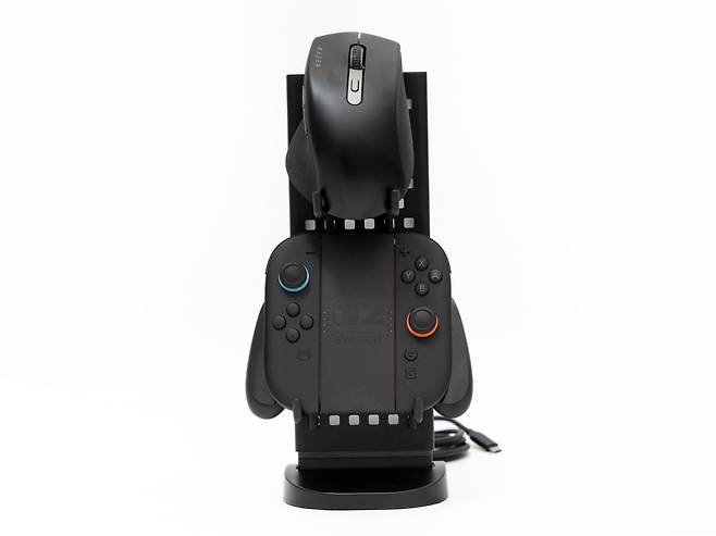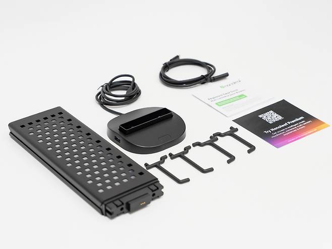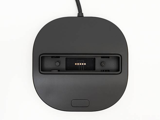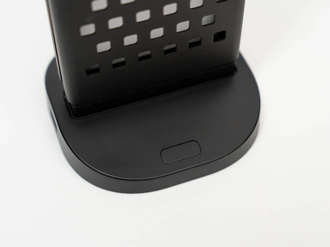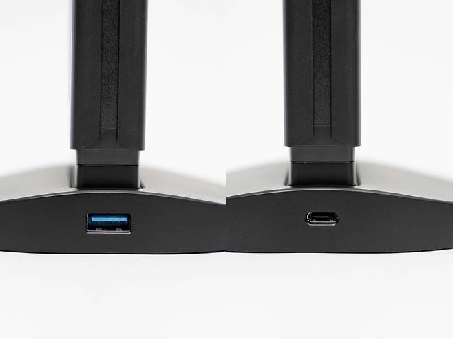 하단의 USB 허브 베이스는 2개의 USB-C 출력 포트와 1개의 USB-A 포트가 제공되어 무선 마우스 동글, USB 메모리, 외장 하드드라이브 등을 연결할 수 있습니다. 특히 무선 키보드나 마우스의 수신기를 연결하면 책상 위의 케이블 정리에 큰 도움이 됩니다.