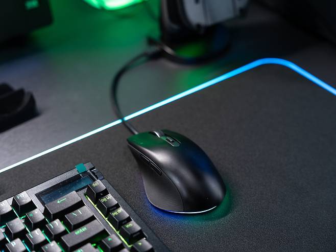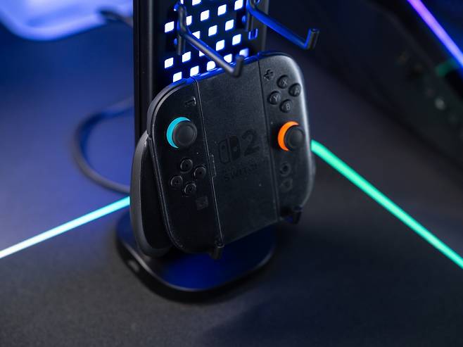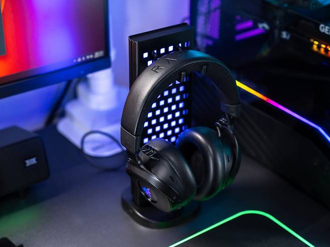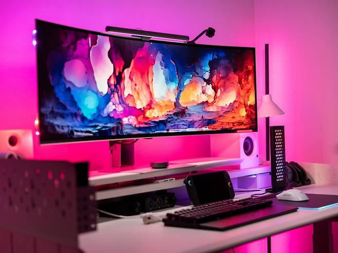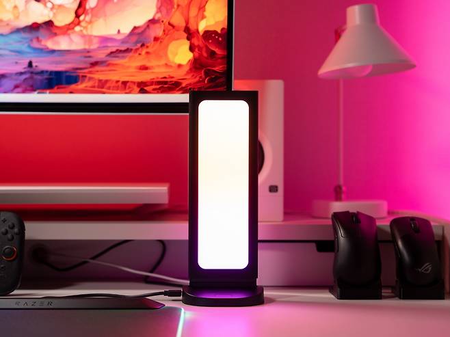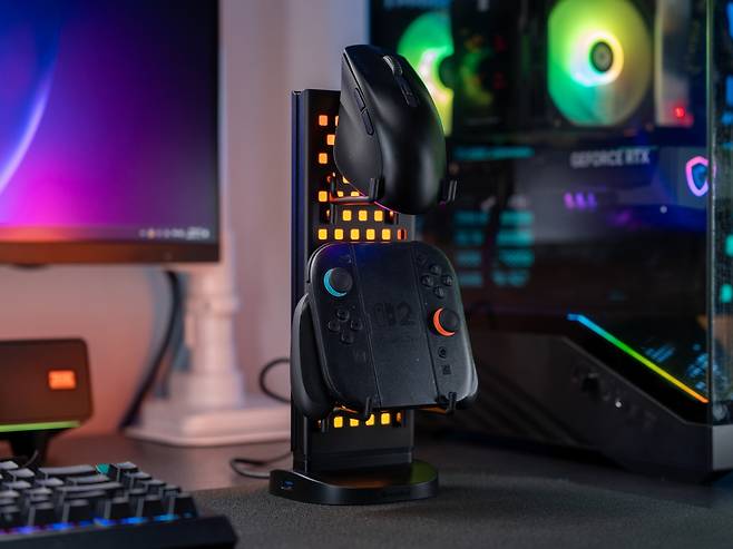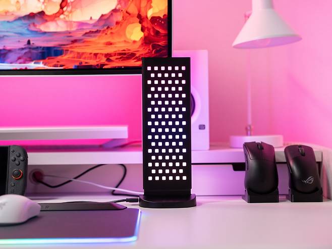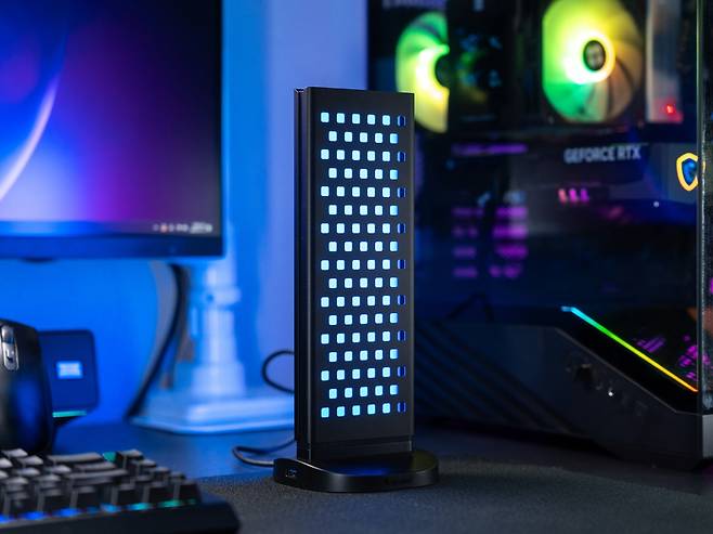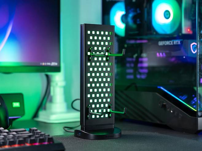 이것이 단순한 수납 기능에 그치지 않는 이유는 페그보드 뒤쪽에서 LED 조명이 구멍들을 통해 은은하게 비춰지기 때문에 페그보드에 걸린 게이밍 기어들이 전시품처럼 돋보이게 만들어 데스크테리어 아이템의 역활을 톡톡히 하고 있습니다.