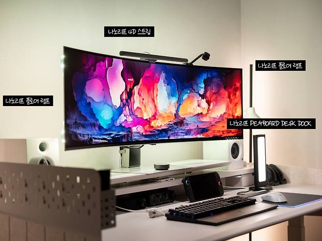 저는 나노리프 4D 스트립과, 나노리프 플로어램프 1조, 나노리프 페그보드 데스크 독 1개로 구성하여 데스크셋업을 하고 있습니다. 이렇게 나노리프 제품들과 함께 사용하시면 훨씬 더 몰입감 있는 조명 환경을 구축할 수 있습니다.