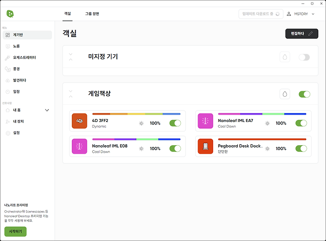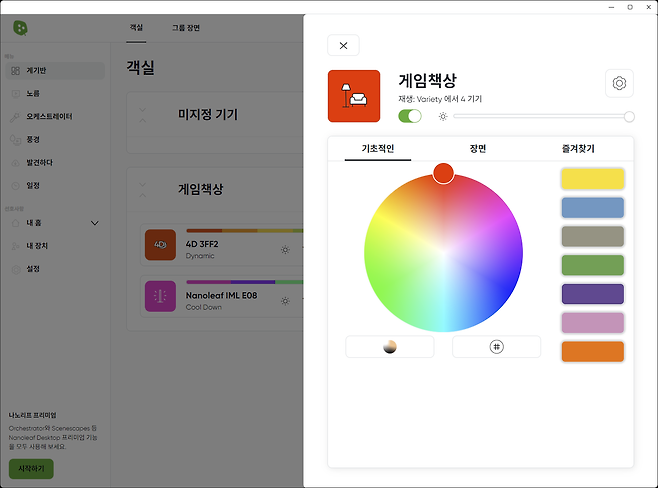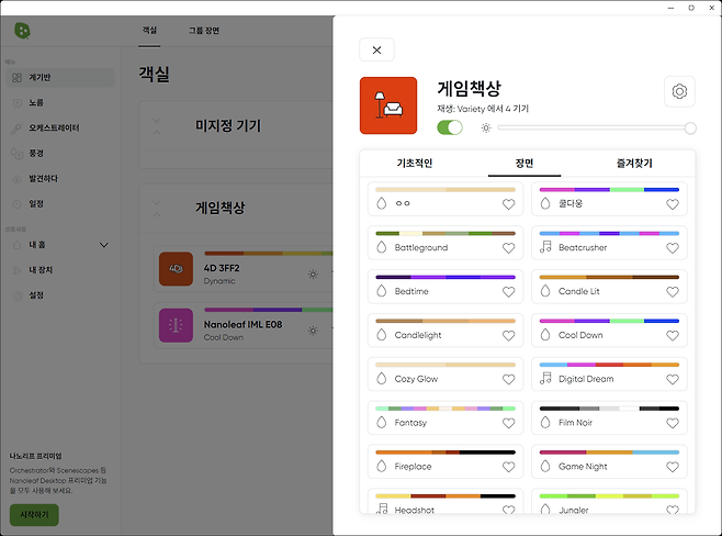 나노리프 데스크톱 앱은 여러 대의 나노리프 기기들을 통합 제어하는데요, 사용자는 각 기기의 조명 색상, 밝기, 효과 등을 세밀하게 조정할 수 있으며, 다양한 프리셋 씬들을 활용하거나 완전히 새로운 커스텀 씬을 만들어낼 수도 있습니다.