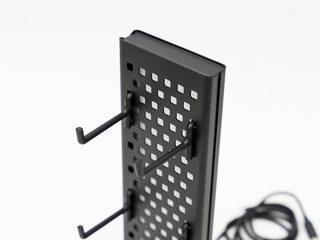 페그보드 면은 일정한 간격으로 구멍이 뚫린 타공판 구조로, 여기에 제공되는 4개의 후크를 자유롭게 배치하여 다양한 액세서리를 거치할 수 있습니다.