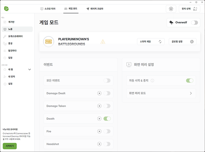 나노리프 데스크톱의 게임 모드는 게임 내 이벤트에 실시간으로 반응하는 조명 효과를 구현할 수 있는데요, 예를 들면 배틀그라운드에서 총격전이 벌어질 때는 붉은색으로, 필드를 걸을 때는 자연스러운 녹색으로 변화하며, 각 이벤트의 색상은 사용자가 커스텀할 수 있습니다. 또한 Razer Chroma나 Overwolf 연동도 지원하여 더욱 풍부한 게이밍 경험을 제공합니다.