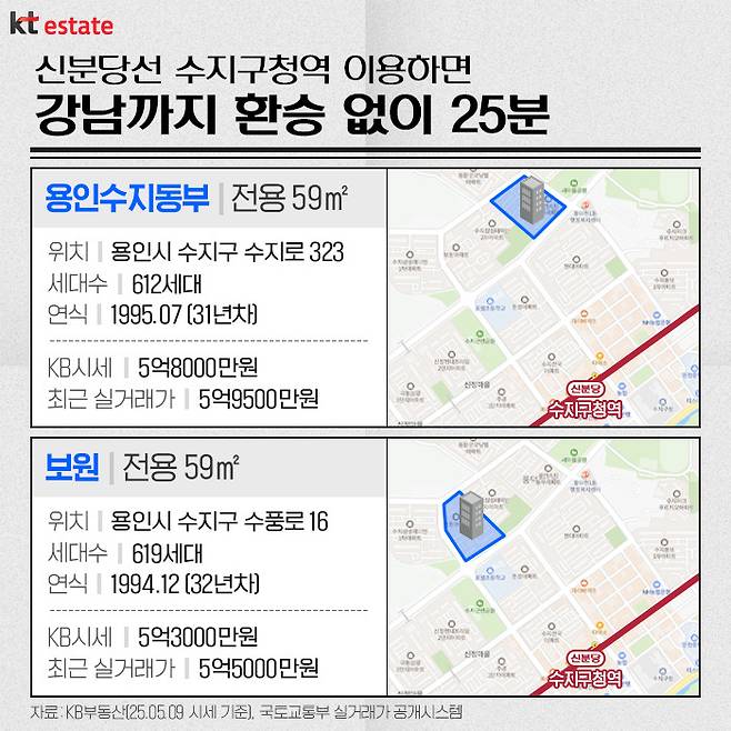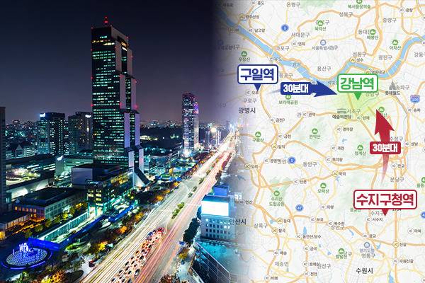 두 번째로 소개해 드릴 지역은 경기도 용인시 수지구입니다. 수지구 내에서도 신분당선 수지구청역을 이용할 수 있는 단지들 중 20평대 6억원 미만으로 구입 가능한 단지들이 있습니다. 신분당선 수지구청역을 이용하면 환승 없이 강남역까지 25분이면 도착 가능해 강남으로 출퇴근하는 신혼부부들이 고려하는 주요 지역 중 한 곳이기도 합니다. 이뿐만 아니라 역을 중심으로 각종 상권들이 잘 발달돼 있으며, 도서관, 학교, 공원 등 편의시설 이용도 편리합니다.