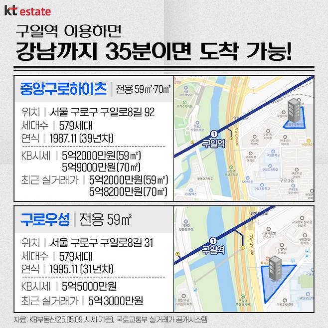 먼저 소개해 드릴 곳은 ‘중앙구로하이츠’ 전용 59㎡, 70㎡입니다. 중앙구로하이츠는 총 579세대 39년차 구축 아파트입니다. 해당 평형은 방 3개, 화장실 1개로 구성돼 있어 아이 키우는 신혼부부에게 적당한 크기입니다. KB부동산에 따르면, 이 단지 전용 59㎡의 KB시세(5월 9일 기준 / 이하 동일)는 5억2000만원이며, 최근 실거래가(2024년 11월 / 9층)도 5억2000만원이었습니다. 전용 70㎡의 경우에는 KB시세가 5억9000만원이며, 최근 실거래가는 2025년 3월 5억8200만원(8층)입니다.