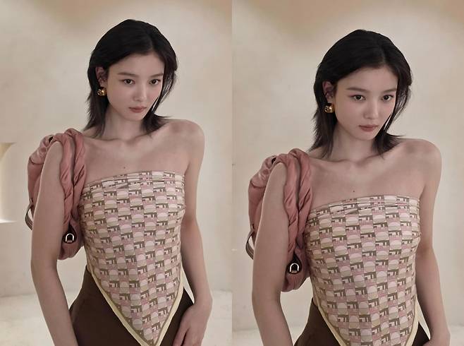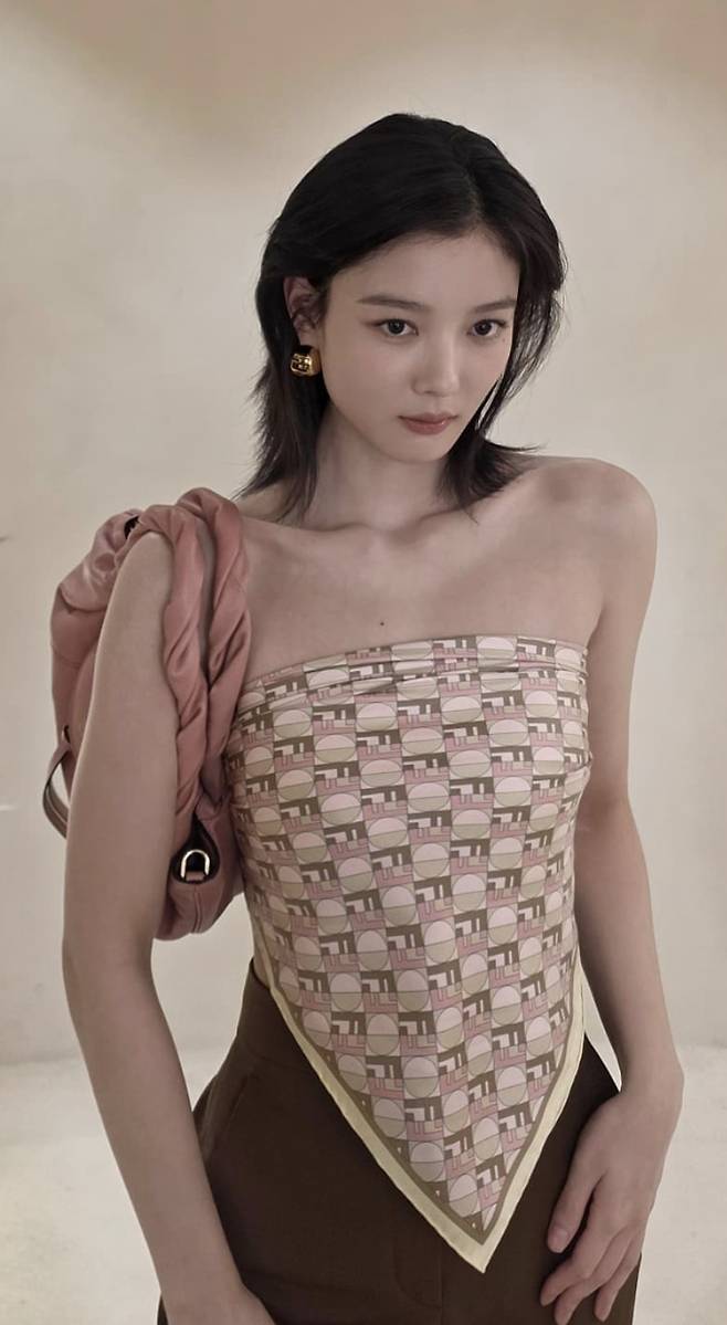 베이지와 핑크 컬러가 믹스된 패턴의 튜브탑을 입고 등장한 그녀는 상체 라인을 강조하면서도 고급스러운 분위기를 놓치지 않았다.