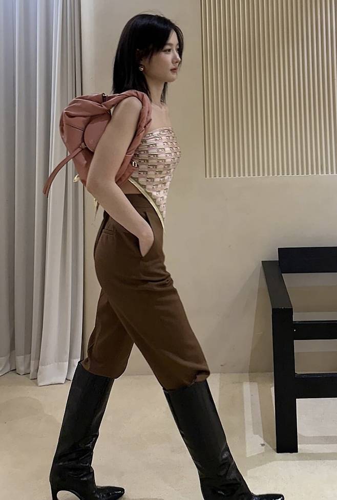 여기에 매치된 팬츠는 다크브라운 계열의 하이웨이스트 슬랙스로, 허리 라인을 안정감 있게 잡아주면서도 세련된 핏을 완성했다. 팬츠 길이는 발목 위로 살짝 올라오는 기장으로 선택되어 부츠와의 조화를 염두에 둔 센스가 돋보였다.