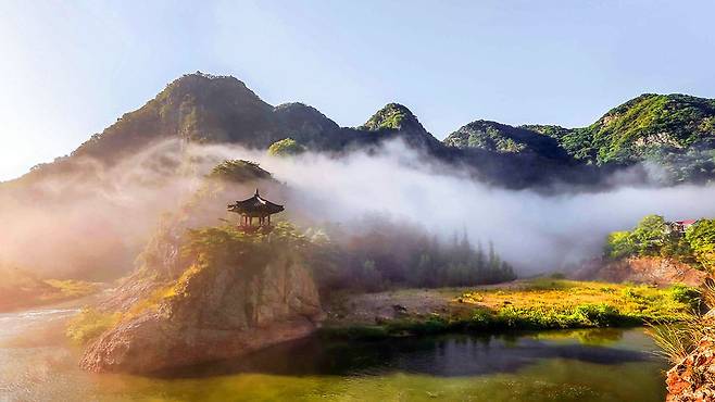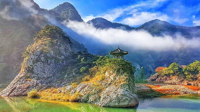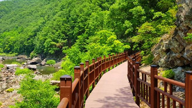 시작점에서 곧장 눈에 띄는 건 절벽 위에 위태롭게 서 있는 월류정이다. 아래로는 청량하게 흐르는 강물과 짙게 깔린 숲의 녹음이 어우러져 그림 같은 풍경을 연출한다.