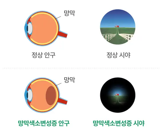 눈으로 들어온 빛을 전기신호로 바꿔 뇌로 전달하는데, 망막색소변성증은 이 망막에 색소가 쌓이면서 망막의 광수용체 세포인 간상세포와 원뿔세포가 점차 손상되며 시력 저하가 진행됩니다.
