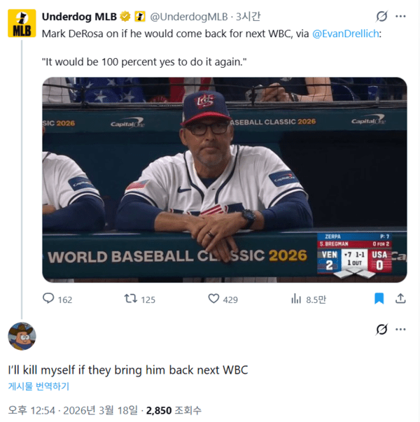 한 팬은 "그(데로사 감독)를 다음 WBC때 재선임하면 나는 자살할 거야(I'll kill myself if they bring him back next WBC)"라며 밀러의 공을 연상케 하는 '돌직구'를 꽂기도 했다.