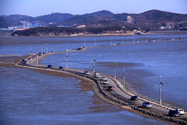 그 중에서 가장 재미있는 장소는 단연 바닷길 건너기입니다. 조수간만의 차이 때문에 4~5m의 물이 사라지고 이전에 보이지 않던 2.3km의 시멘트 도로가 드러나는 한국판 모세의 기적을 보여줍니다.
