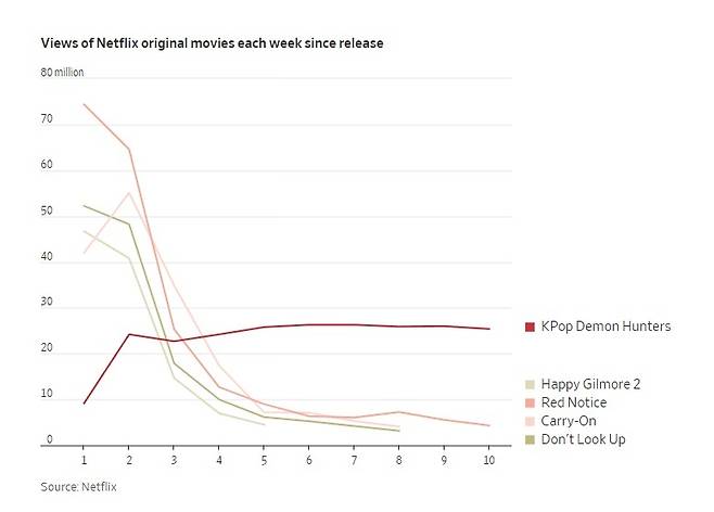 2021년 11월 공개된 드웨인 존슨, 라이언 레이놀즈 주연의 액션 스릴러 영화 <레드 노티스>가 시청 수 2억3090만으로 3년 넘게 1위 자리를 지켜왔으나 <케이팝 데몬 헌터스>에 밀려 2위로 내려앉았다.
