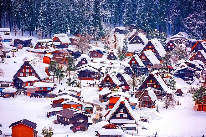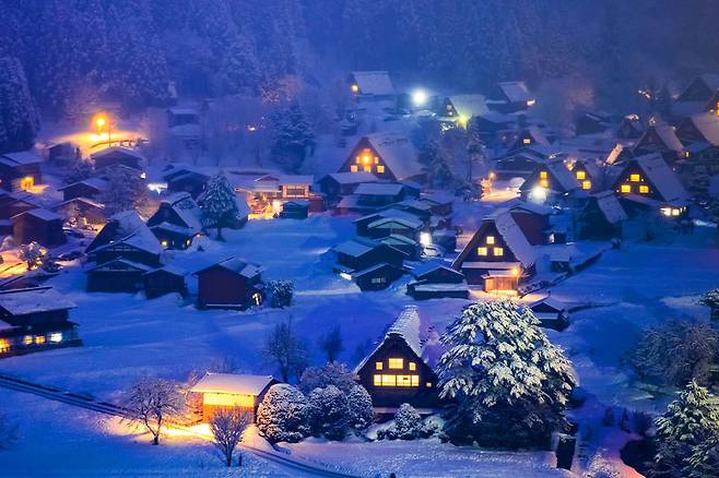 기후현에 위치한 시라카와고는 유네스코 세계문화유산으로 등재된 전통 마을로, 겨울이 되면 갓쇼즈쿠리 양식의 초가집들이 눈에 덮여 마치 동화 속 풍경을 연출합니다.