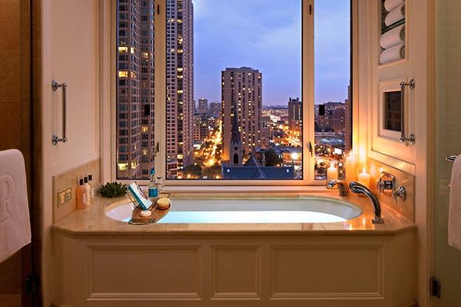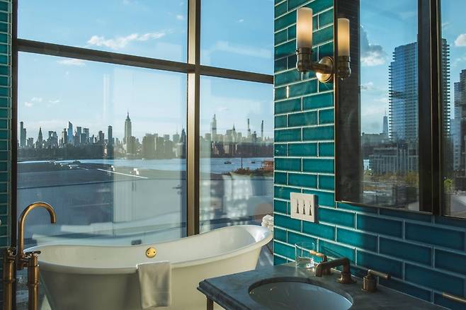 욕실 뷰: 욕조에서 바라보는 맨해튼과 브루클린의 스카이라인은 인스타그램 촬영 명소로도 유명합니다.