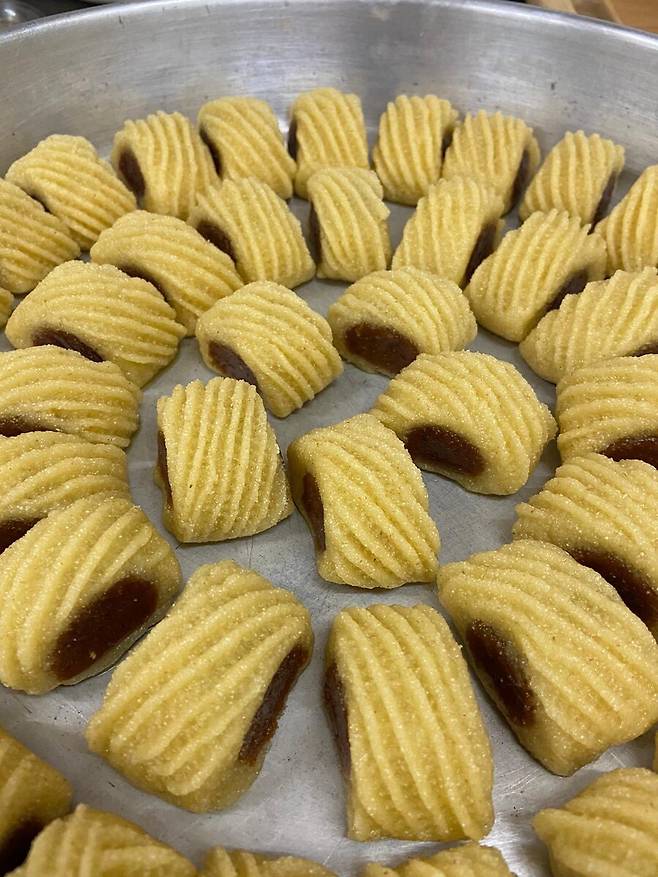 세몰리나와 밀가루로 섞어 만든 도우를 말아버려서 구운 다음