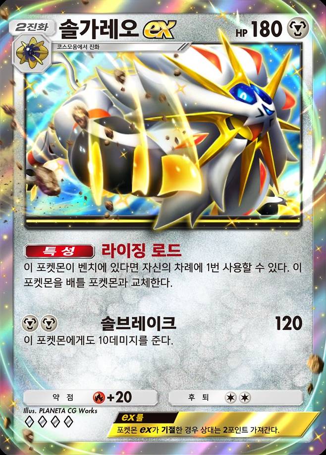 '솔가레오 ex'와 '루나아라 ex'는 물론 '알로라 라이츄 ex' 등을 비롯해 '포켓몬스터썬·문'의 스타트 포켓몬 나몰빼미, 냐오불, 누리공 등 신규 카드를 만나볼 수 있다.