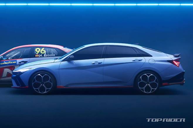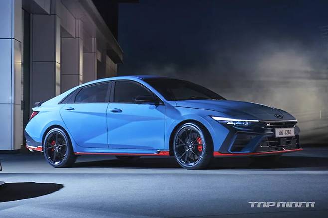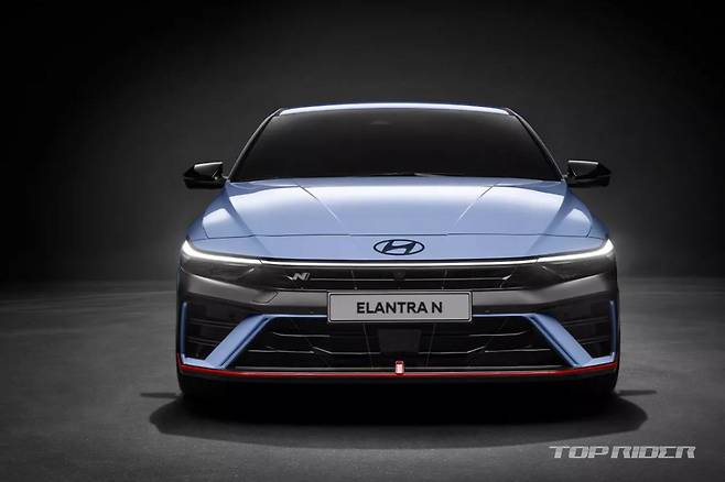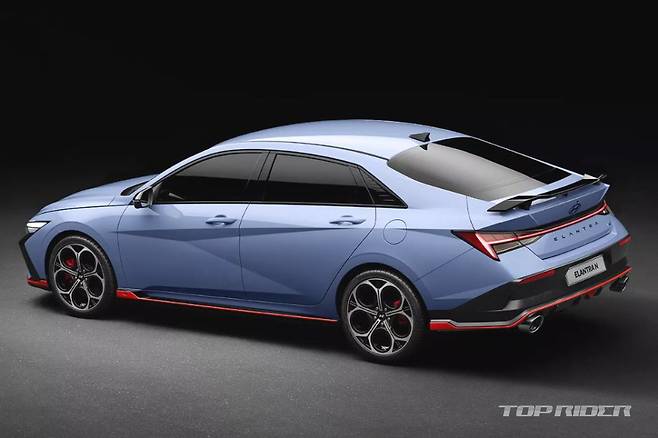 신형 아반떼 N 전면부는 기본형 대비 블랙 트림부를 확대하고 외장 컬러 가니쉬를 추가해 한층 더 낮은 자세로 역동성이 강조됐다. 특히 더욱 볼드해진 범퍼의 캐릭터는 고성능 특유의 공격적인 모습을 구현한다. 측면부에는 사이드실 몰딩 등 N 전용 레드 스트립이 탑재됐다.