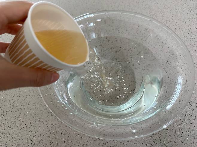 수세미를 담을 수 있는 용기에 물을 담아주세요. 물의 양은 수세미가 잠길 수 있을 정도로 해주세요. 식초 양은 종이컵 기준으로 반컵 준비해 주세요.