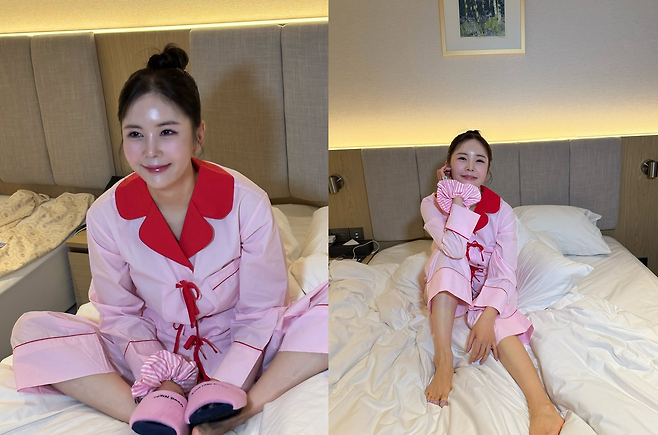 방송인 장영란이 최근 소셜 미디어에 호텔로 추정되는 공간에서 분홍 파자마를 입고 찍은 셀카를 공개했다. 그녀는 "모든지 열심히. 협찬사진도 열심히. 행복한 금요일되세요 내새끼 인친님들 늘 감사합니다"라는 메시지와 함께 사진을 게재했다.
