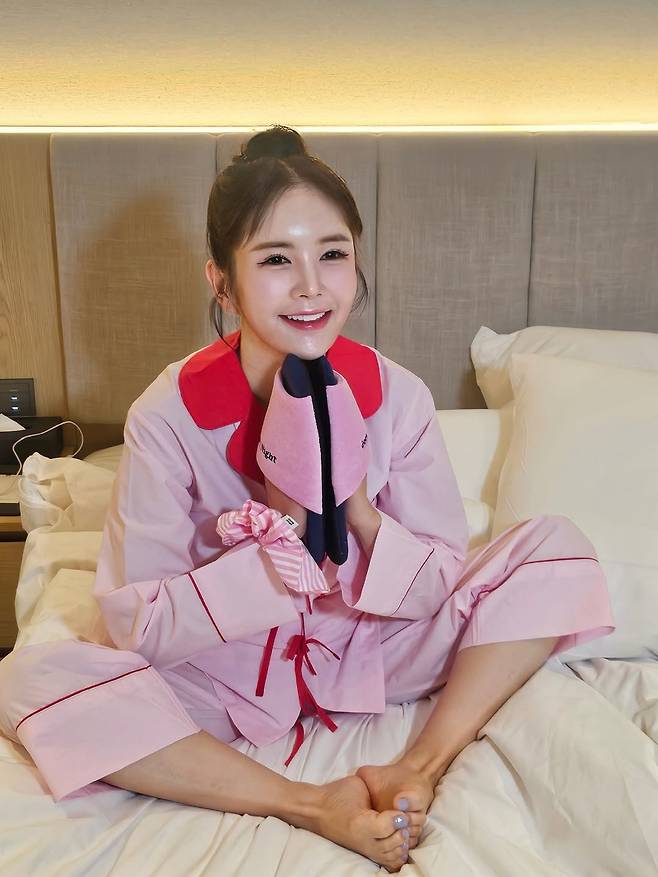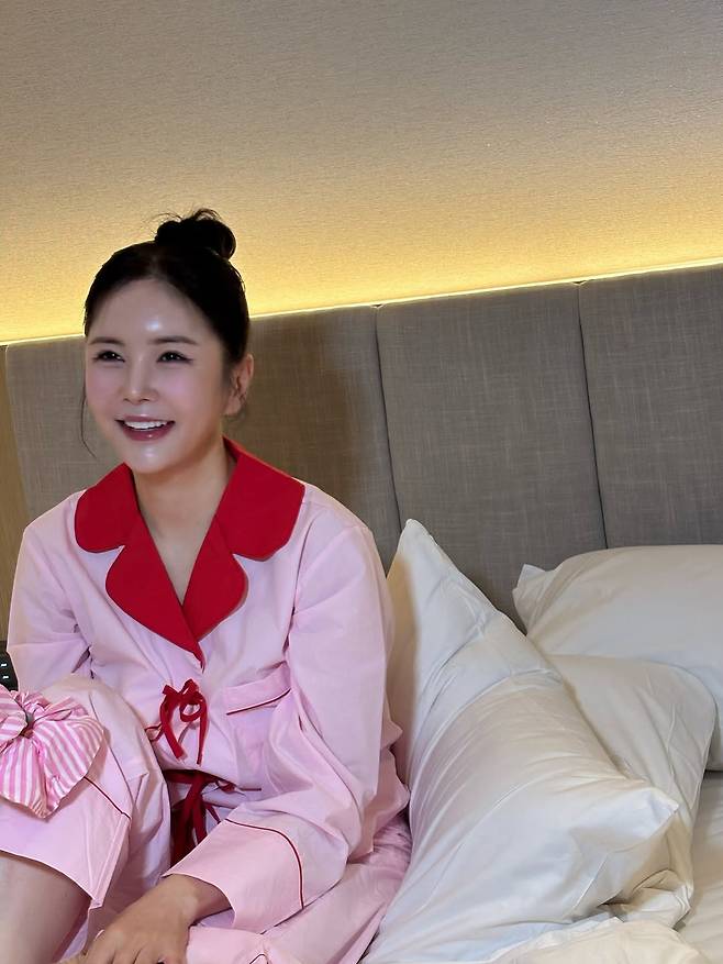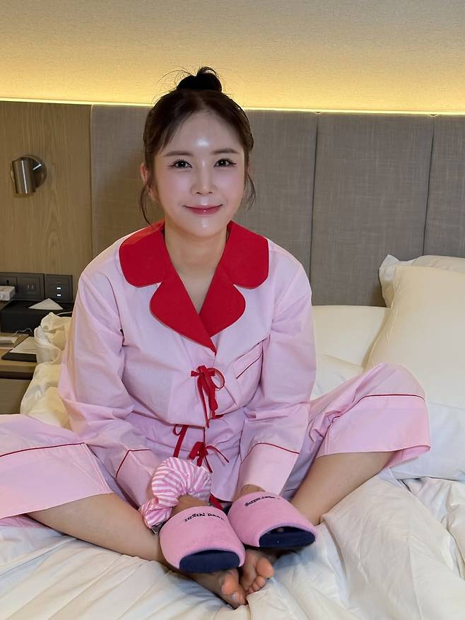 따뜻한 조명 아래, 크림빛 침대 위에 앉은 그녀의 미소는 금요일 밤처럼 포근했다. 머리를 동그랗게 올려 묶은 상투 헤어는 귀엽고 발랄했고, 몸을 감싼 연분홍 파자마는 마치 달콤한 솜사탕처럼 사랑스러웠다.
