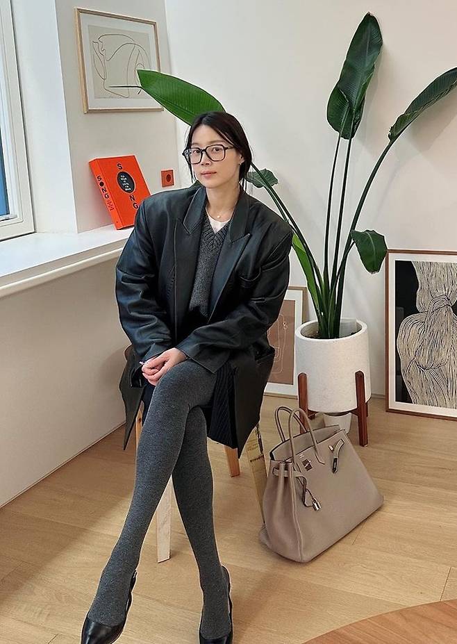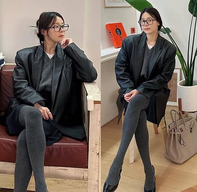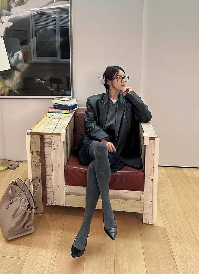공개한 사진에서 한지혜는 그레이 스타킹과 네이비 미니 스커트를 입고 화이트 셔츠와 그레이 니트에 블랙 가죽 재킷을 착용한 톤온톤 레이어드 스타일로 시크하면서도 멋스러운 외출 스타일을 완성했다.