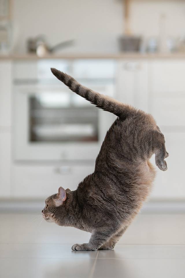 인간처럼 고양이도 나이 들면 더 등이 굽어집니다. 젊은 시절 기민한 움직임으로 멋진 신체 능력을 자랑했던 고양이도 나이 들면 근력 저하나 관절염 등으로 등이 더 굽어질 수 있습니다. 만 10세 이상이 되면 혈기 왕성했던 젊은 시절과 같은 자세나 움직임이 어려워지므로, 편안하게 살 수 있도록 환경을 바꿔줘야 합니다.