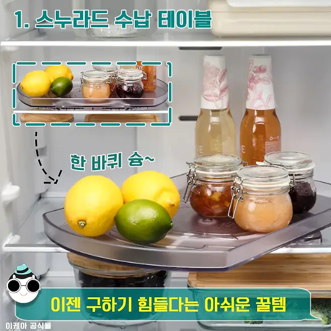 저에게는 스누라드 테이블이 딱 그랬답니다. 냉장고에 회전 선반을 설치해서 위치를 파악할 생각을 했다니 다시 봐도 아이디어 대박 GOOD.