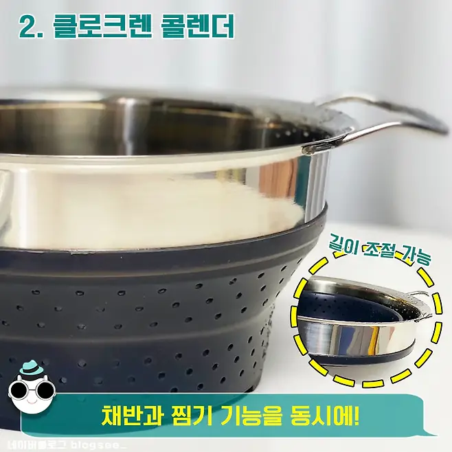 다음으로 소개드릴 제품은 찜기와 채반의 기능을 동시에 가지고 있는 제품이랍니다. 채소를 씻고 데칠 때 이 콜렌더 하나만 있으면 여러 식기를 꺼낼 필요가 없이 한 번에 조리가 가능해요.