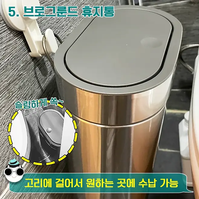그리고 뒤에 고리가 달려 있어서 바닥에 놓지 않고 원하는 곳에 매달아 사용할 수 있어요. 특히 주방에 설치한다고 치면 벽의 여유 공간에 걸어두고 사용하면 요리할 때 동선이 간편해져 너무 좋아요.