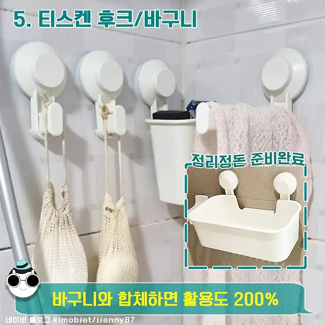 또 단순히 다용도 걸이로 사용해도 좋지만, 같은 브랜드 사의 흡착식 바구니와 콜라보하면 활용도가 200% 증가한답니다. 특히나 욕실이 좁아서 항상 불편하셨던 분들이라면 얼른 쟁여야 할 살림꿀템이에요!