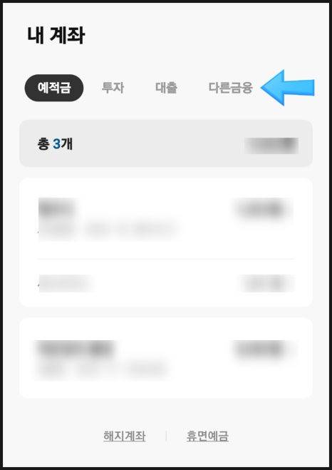 내 계좌를 누르면 상단에 예적금, 투자, 대 출, 다른 금융이 나오는데요.