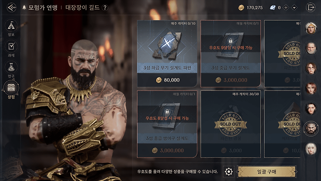 길드 상점에서는 코스튬, 팬텀 웨폰 소환 상자, 주문석 상자, 희귀 장비 설계도, 카드팩 등 필수 아이템을 구매할 수 있다.