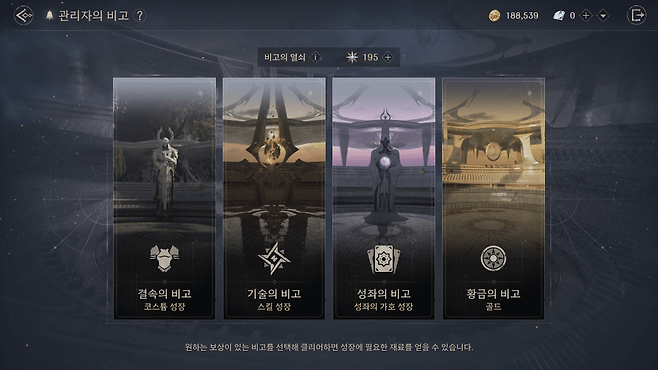 관리자의 비고는 성장에 필요한 핵심 재료를 파밍하는 던전형 콘텐츠다. 결속의 비고, 기술의 비고, 성좌의 비고, 황금의 비고 네 종류로 나뉘며, 각각의 테마에 따라 획득 가능한 보상이 다르다.
