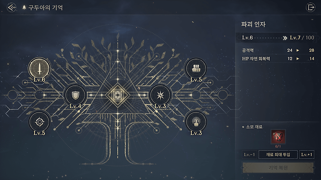 구두아의 기억은 기억 파편을 사용해 인자 레벨을 올리는 구조다. 인자마다 필요한 파편의 종류가 다르며, 이를 통해 공격력, 명중, 방어력, 치명타 등 주요 능력치를 강화할 수 있다.