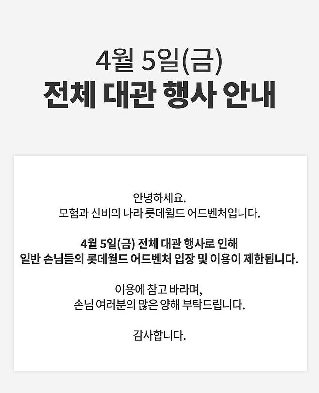 공지문에는 "4월 5일(금) 전체 대관 행사로 인해 일반 손님들의 롯데월드 어드벤처 입장 및 이용이 제한된다. 이용에 참고 바라며, 손님 여러분의 많은 양해 부탁드린다"고 적혀있다.