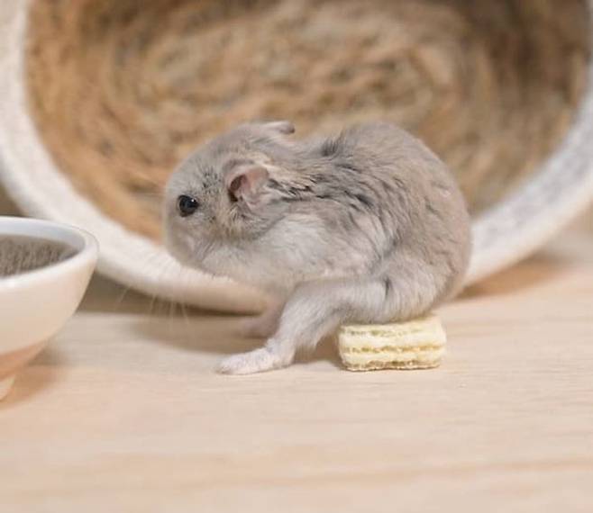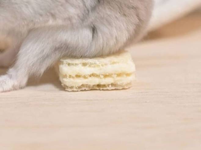 공개된 사진 속에는 합성이 아닌가 의심이 들 정도로 햄스터가 웨하스 과자에 엉덩이를 깔고 앉아 있었는데요.