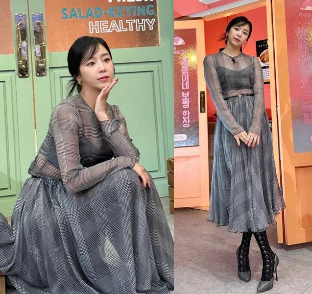 예원이 고급스러운 체크 패턴 드레스로 가을 분위기를 한껏 살렸습니다.