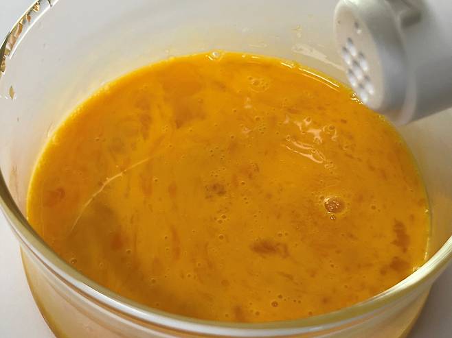 계란찜의 기본 간은 맛소금으로 맞추세요. 맛소금 5~6꼬집을 넣어서 기본적인 간을 해줍니다. 간장보다는 소금 간을 하는 편이 색이 탁해지지 않고, 부드러운 노란색을 유지할 수 있습니다.